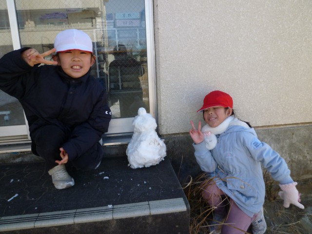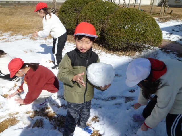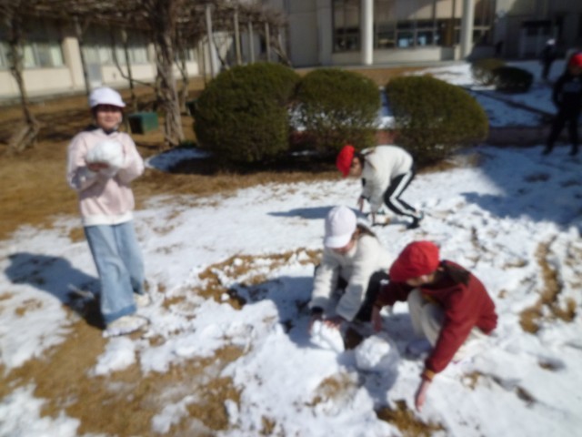 雪合戦をやるには、雪が固くなっていたので、雪だるま作り!