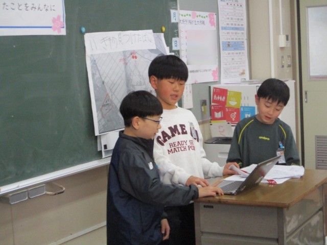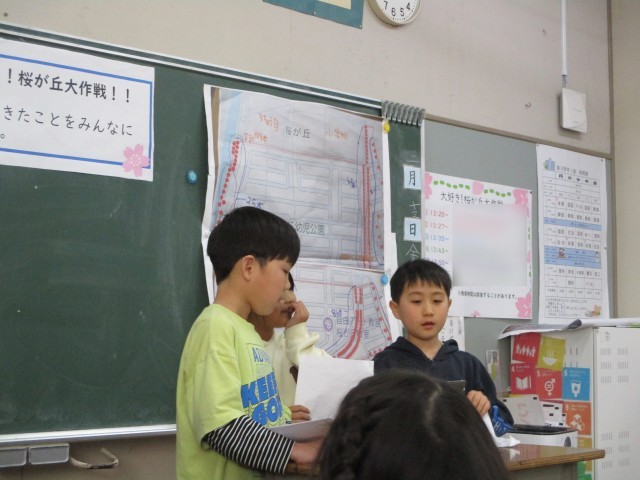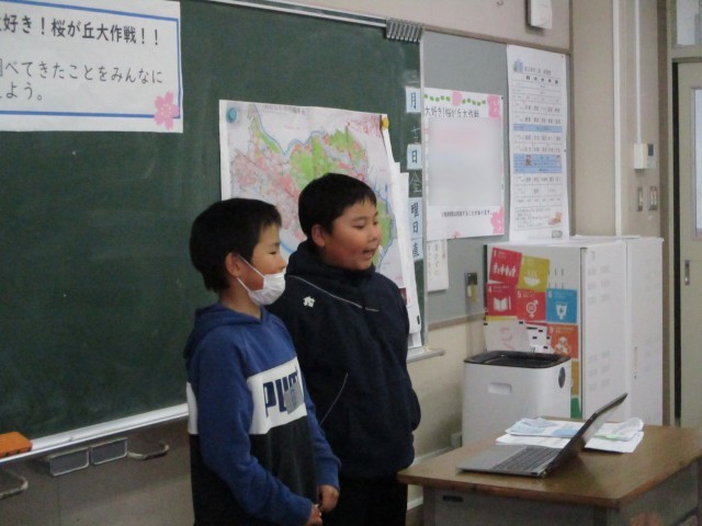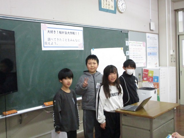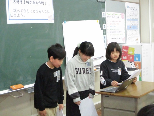 今日の授業参観では、総合的な学習の時間で1年間取り組んできた「大好き!桜が丘大作戦」の発表をしました。情報集めからパワーポイント作成まで、子供たちが自分たちで進めてきました。始まる前は緊張している子が多かったですが、発表を進めるにつれて空気も和やかになり、皆良い発表をすることができていました。1年間がんばりましたね!