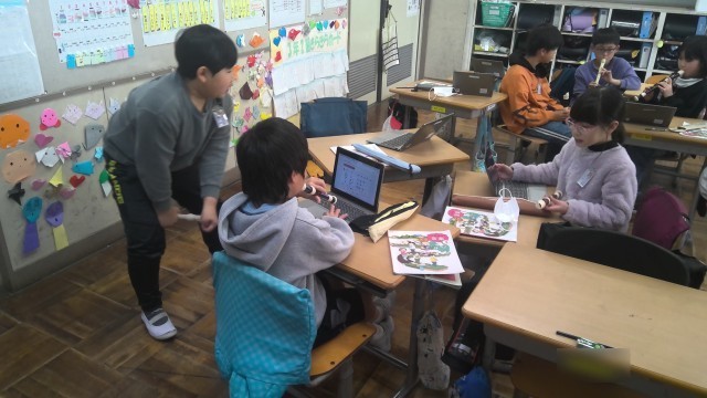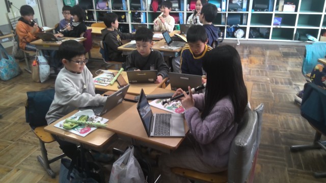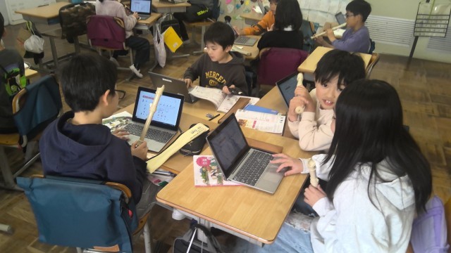 音楽の時間に、お祭りなどで演奏される「おはやし」を、リコーダーで自作してみました。グループごとに考えたおはやしを練習し、自分たちの好きなように作成していきます。それぞれのグループで、個性あふれるおはやしを作ることができました。