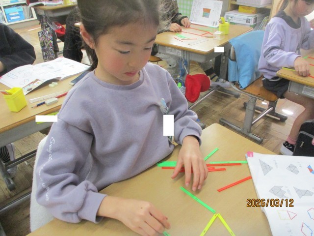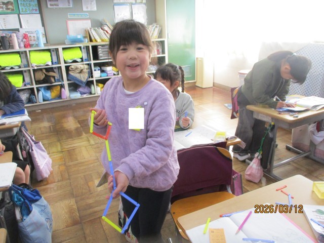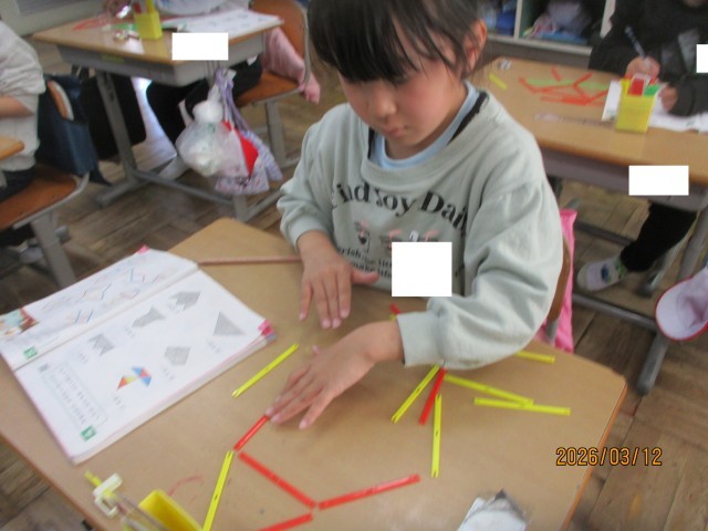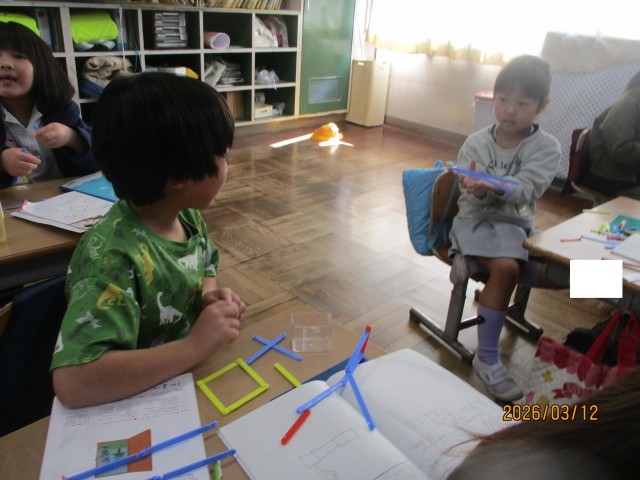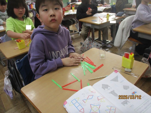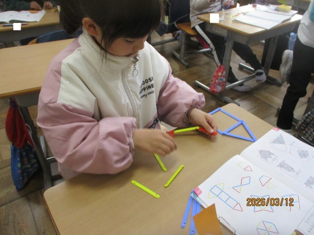 今日の算数の時間は、数え棒を使って、様々な形づくりを行いました。形づくりをしながら、「〇本でできた!」「3本で大きな三角ができた!」など、たくさんのことを発見することができました。