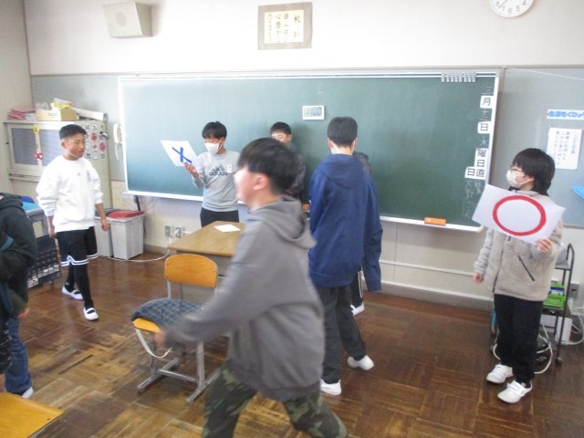 クラスで最後の思い出を残すために、6年生は学級レクをしました!6年1組は「なんでもバスケット」「〇✕クイズ」。6年2組はドッジボール、ドッジビー、缶蹴りをやりました。みんな笑顔で、とても楽しい時間を過ごすことができました。写真は、6年1組の学級レクの様子です。