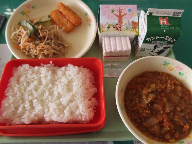 桜が丘小☆絶好調~最後の給食~ 公開日 2026/03/16 更新日 2026/03/16 お知らせ 今日は、クラスのみんなで食べる最後の給食。 献立は、ごはん、牛乳、キーマカレー。ハッシュドポテト、ごぼうサラダ、お祝いケーキでした。 +1