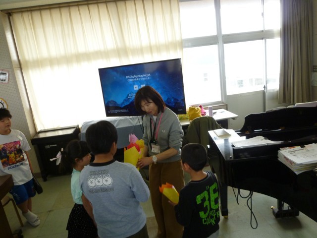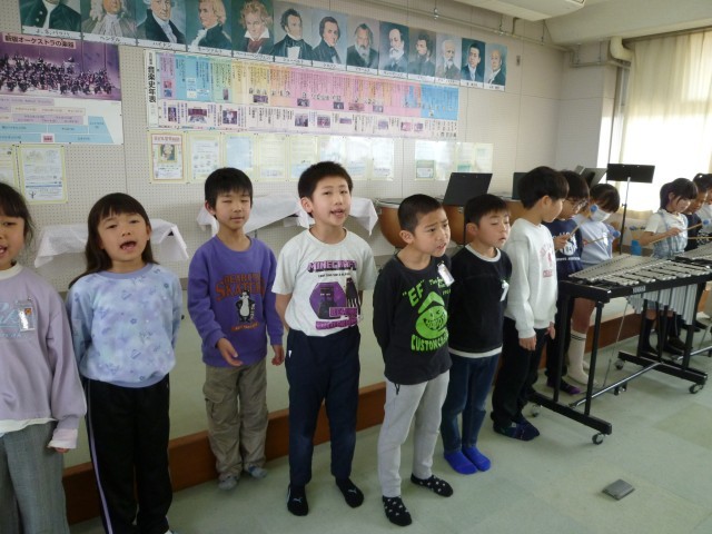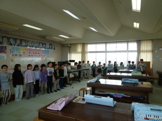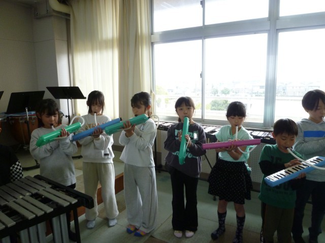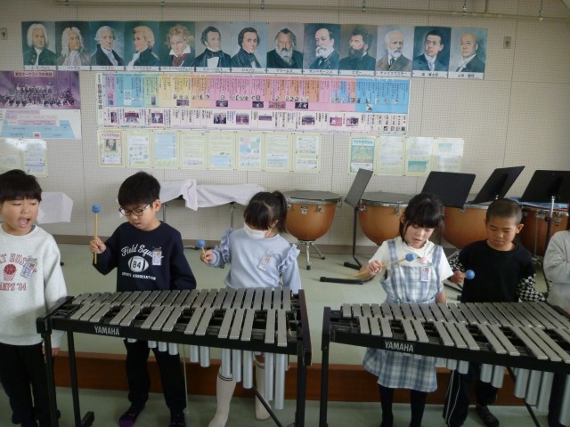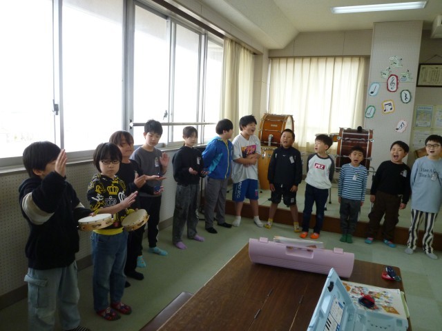 伴奏に合わせて、歌や鍵盤ハーモニカ、カスタネット、タンブリン、鉄琴のハーモニーが音楽室に響きました。