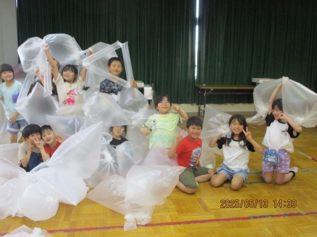 図工ではビニール袋を使って遊びました。空気をパンパンにつめた袋を投げ上げたり、抱えてみたり・・・。たくさんのビニール袋をつなげたり積み上げたりして、体全体を使って楽しみました。使った袋は空気を抜いて、テープを剥がし、たたむところまで、しっかりできました!