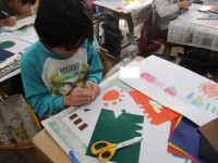図工で版画作りに挑戦しています。下絵を見ながら、色紙を切って、台紙に貼っていま...