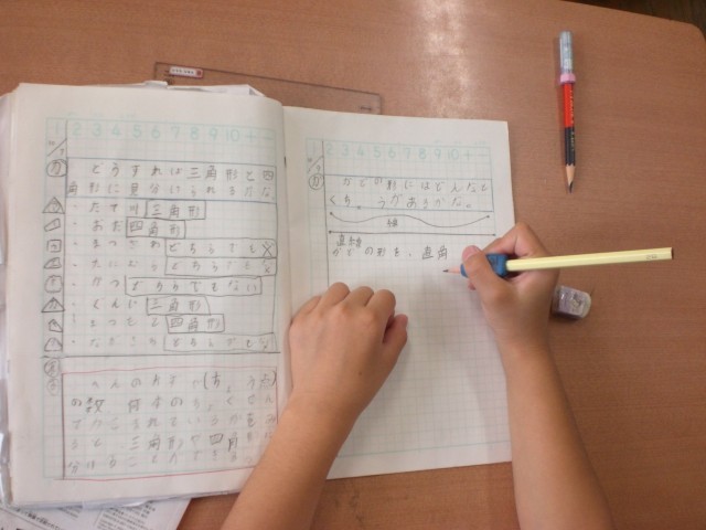 今日の算数のキーワードは、「直角」です。算数で使う用語は、正確に覚えます。どんな場合に直角となるのか、定義も含めて覚えていきます。