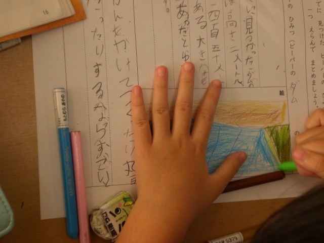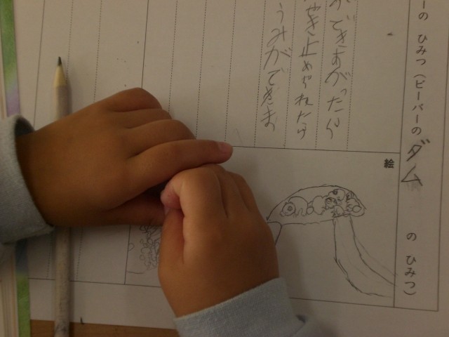 資料を読んで、ビーバーのひみつを1つ、取り上げて文章と絵に表します。文章に合わせてどんな絵を描けばいいのかしばらくなやんでいましたが、描き始めるとすいすいです。絵があるとわかりやすいですね。