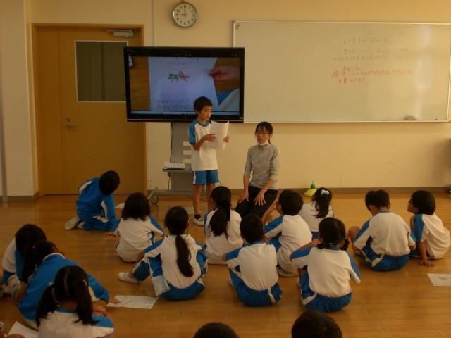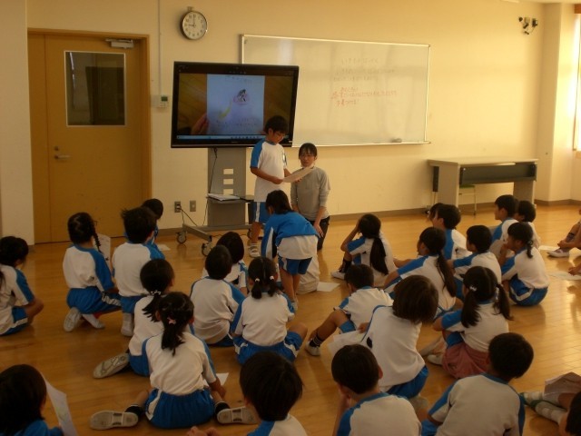 秋の校庭で見つけた生き物をスケッチし、文でまとめたプリントを使って発表会を行いました。発表したいという子がたくさん出てきて、先生もモニターに映す作業に大忙しでした。