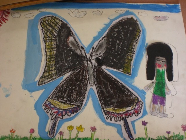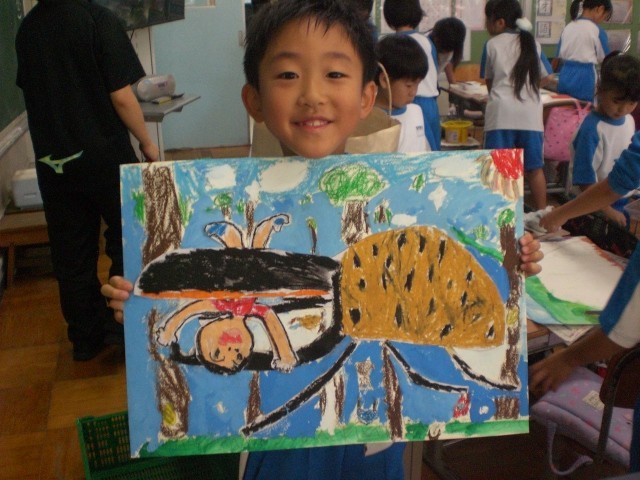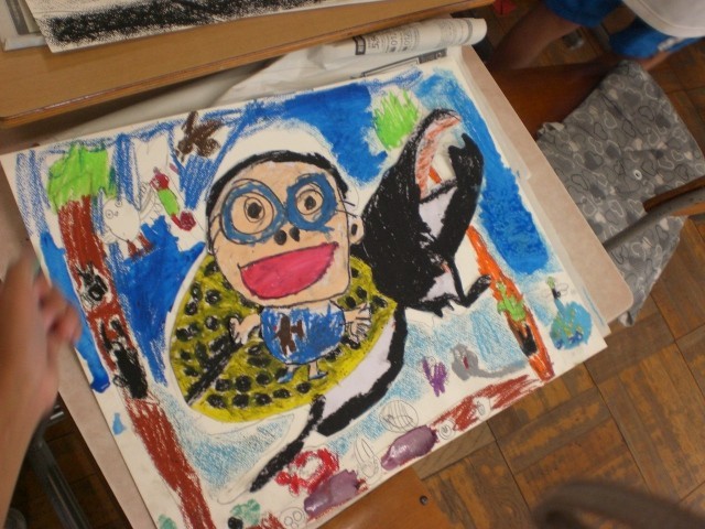 画用紙いっぱいに絵を描いたあとに、別に作っておいた虫のモチーフを切り取って貼り付けます。立体的な作品ができあがってきましたね。
