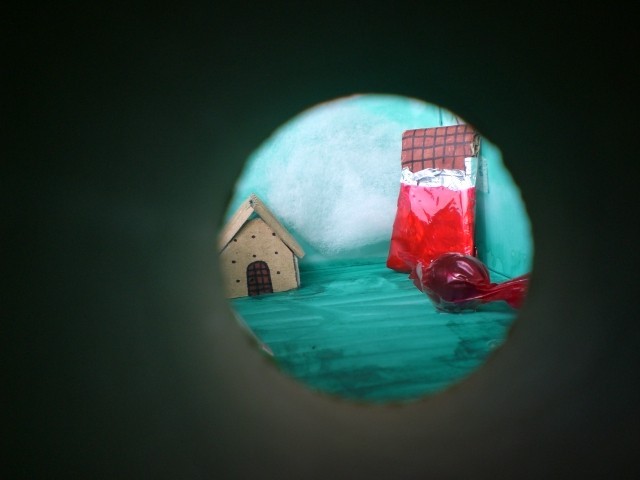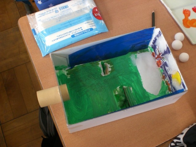箱の一面に開いた丸い窓からのぞくとどんな世界が見えるのか、それを考えながら箱庭を作っていきます。遠近感を考えながら試行錯誤を繰り返しながら仕上げていきます。