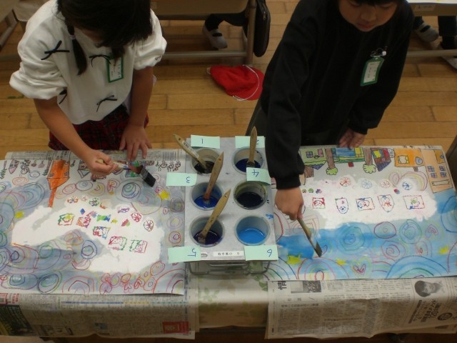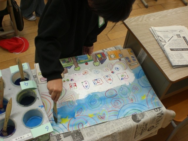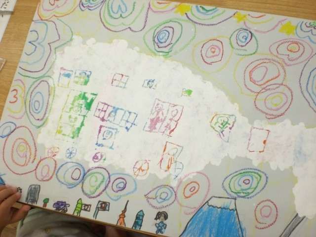 こつこつと作り上げてきたけむりのきしゃも、仕上げ段階に差し掛かっています。背景を水彩絵の具で塗っていきます。
