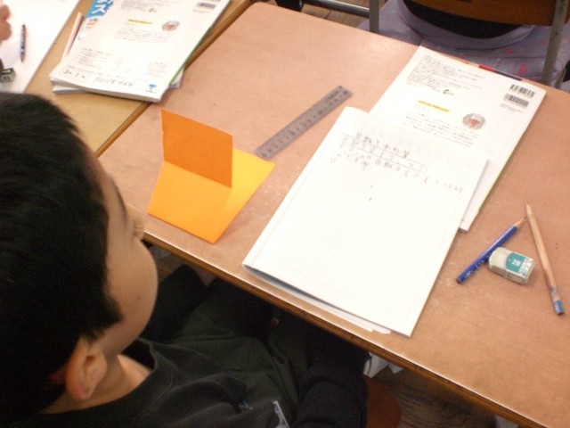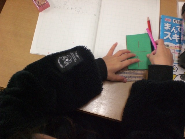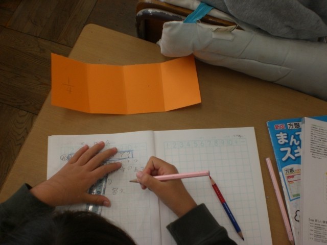 分数の学習です。1を4つに分けたうちの1つを4分の1といいますが、それを具体物を使って実感しています。わかりやすいですね。