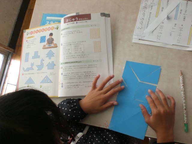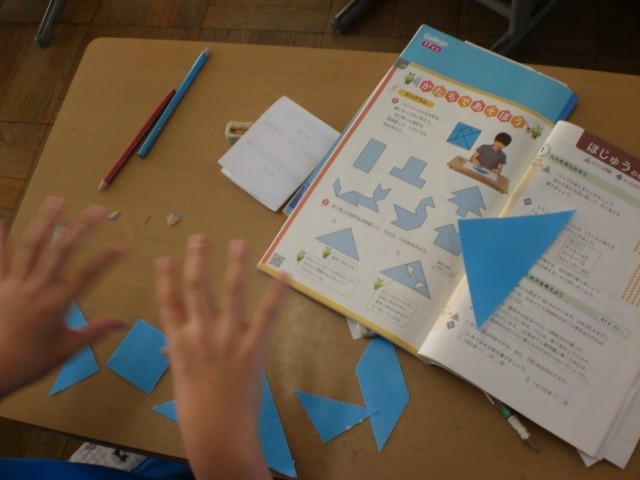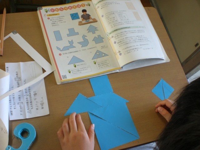 いろんな図形を組み合わせて、完成図のような形ができるかどうか挑戦中です。三角形や四角形の性質を考えながら、試行錯誤しています。