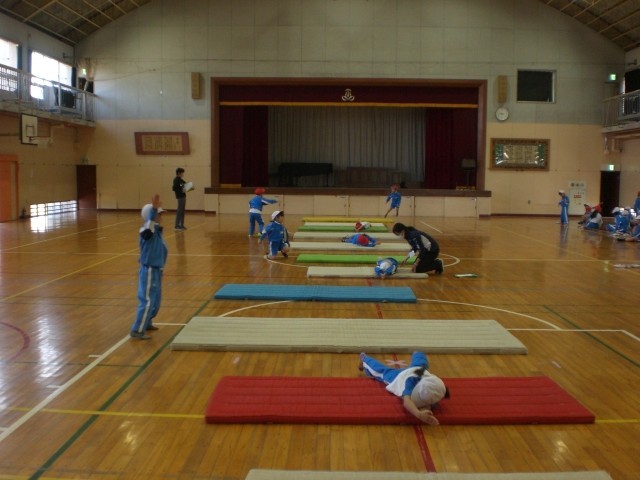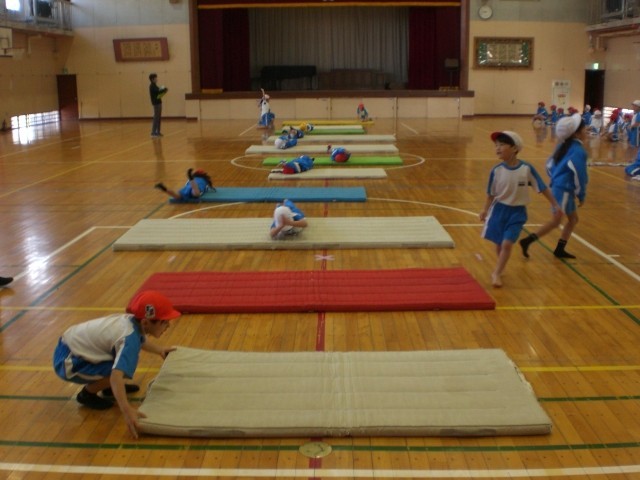 体つくり運動 公開日 2025/11/17 更新日 2025/11/17 1年生のページ マットを使って体つくり運動です。マットの長さいっぱいまで体を回転させて進みます。終わったら次の人への合図もしっかりできていました。