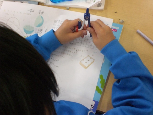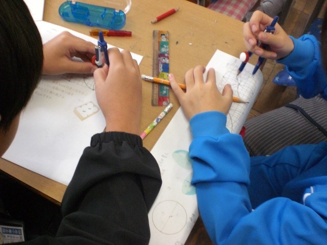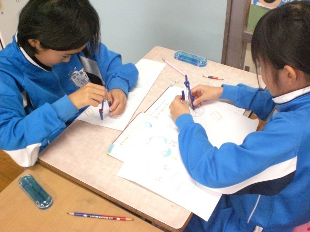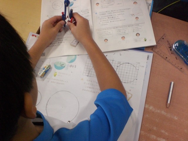 算数の時間です。コンパスを使った円の書き方を思い出しながら、練習問題に取り組みます。友達と一緒に、悪戦苦闘しながらも、上手に書けるようになってきました。