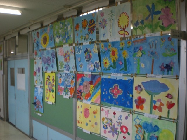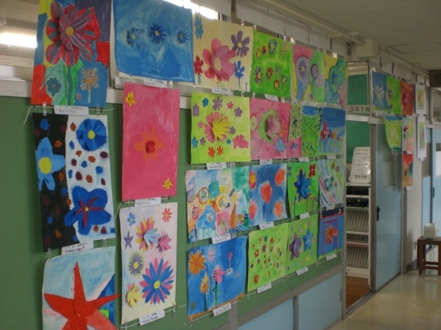 3年生の廊下掲示です。立体的に作った作品が並びます。どれも力作ですね。