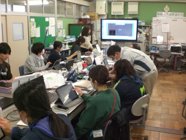 今日は、ICTを使った新しいアプリケーションの使い方の研修会でした。市のICTスタッフの方を講師にお迎えして、授業の中でどう使えばいいか、どんな使い方ができるかなどを考えながら、研修を深めました。