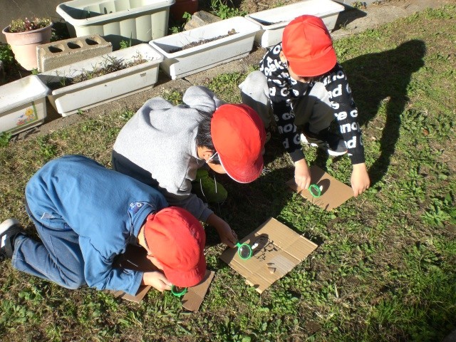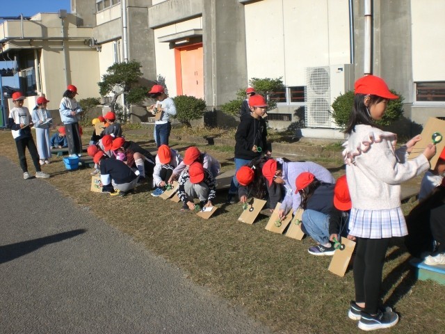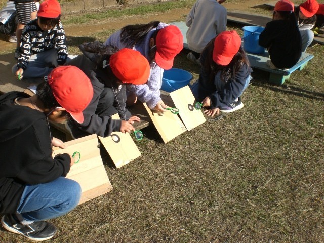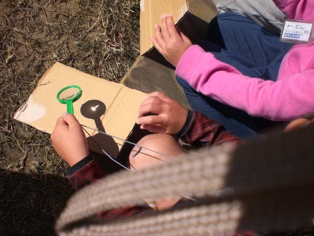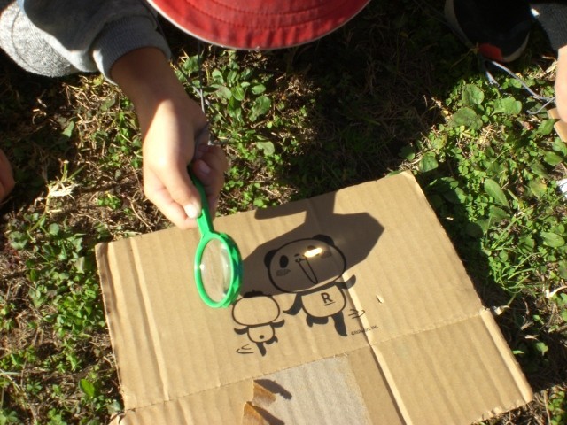 3年生の理科。太陽の光について学んでいます。今日は、虫眼鏡を使って太陽の光をあつめるとどうなるかを実験しています。光を集めると、段ボールから煙が出てくる体験をして、みんな驚いていました。百聞は一見に如かず、ですね。