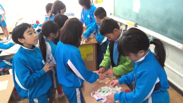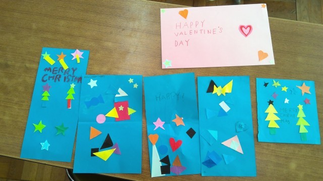 自分がほしい形を相手に伝えたり、尋ねたりする活動を行いました。色々な形を集めて、グリーティングカードを作成しました。
