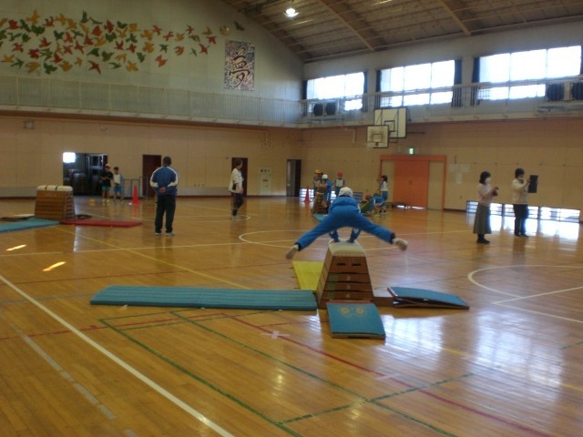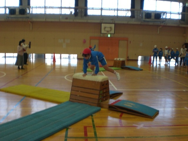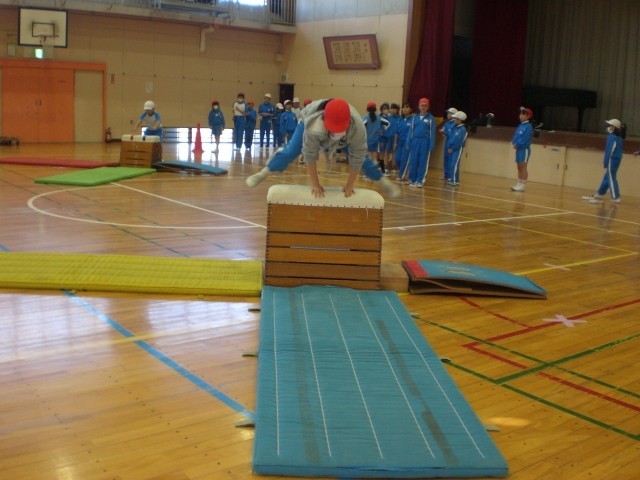 自分の技量に応じた高さの跳び箱を選んで、開脚、閉脚、台上前転などの技に挑戦します。みんな上手に跳べますね。