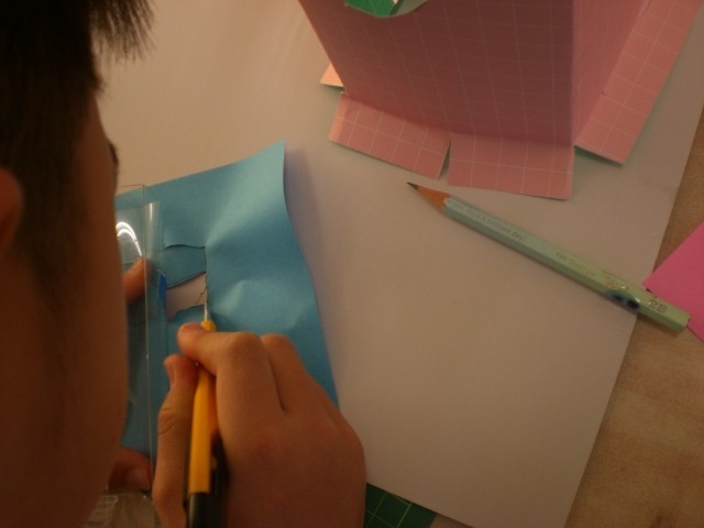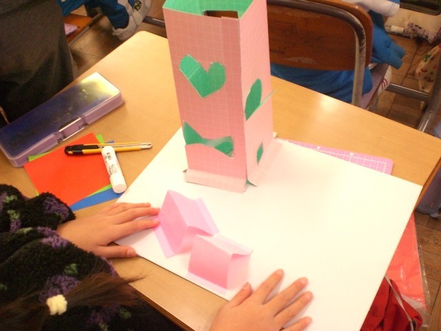 カッターの使い方を学んだあとは、まどのあるたてものを作ります。窓の形を工夫し、カッターで切ってデザインしていきます。カッターの使い方、上手ですね。