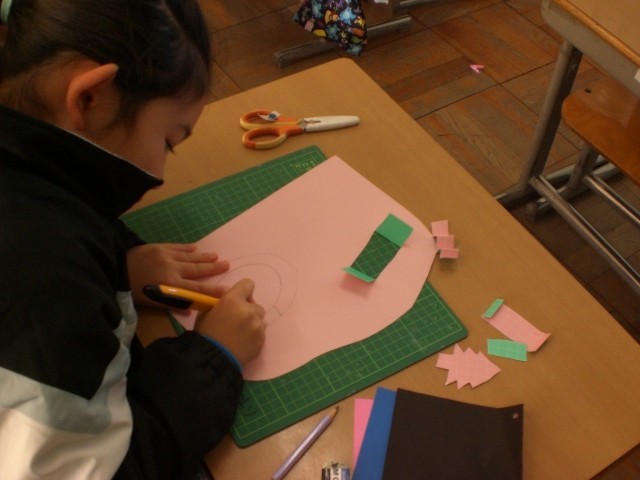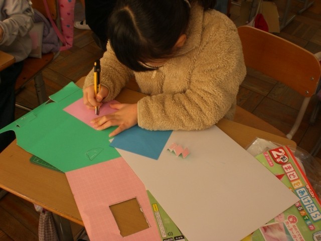 カッターナイフを使って、立体作品を作ります。だいぶ完成に近づいてきましたね。カッターの使い方も慣れてきました。