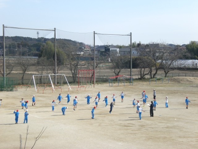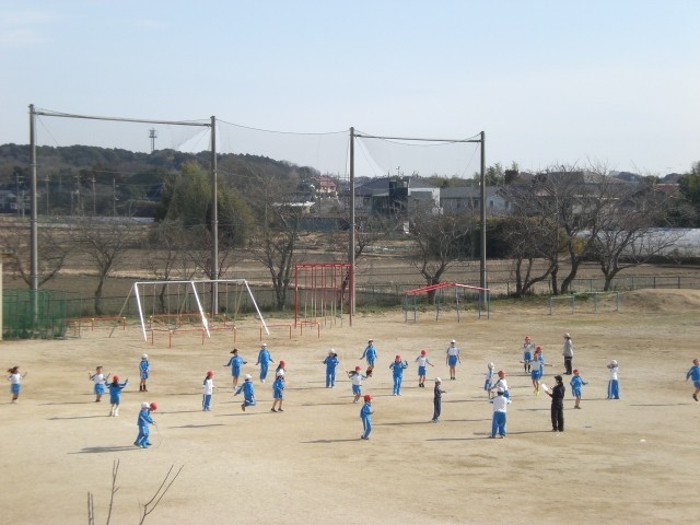 冬ばれの中、2年生の体育は、縄跳びです。休み時間も練習している子が多く、みんな上手ですよ。