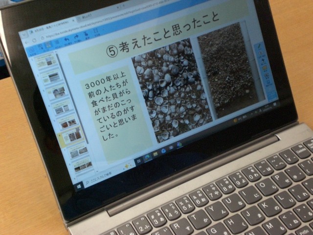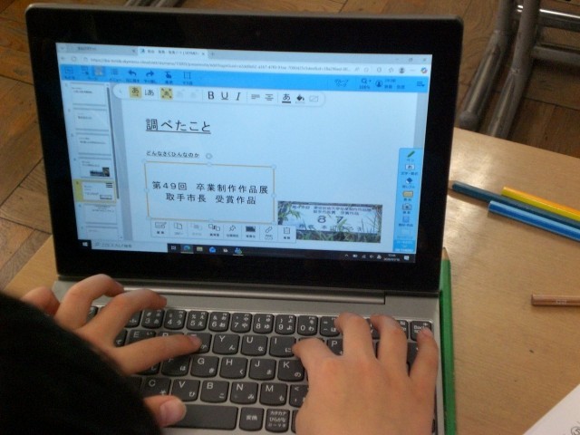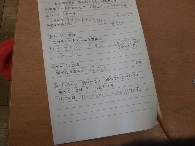 取手市について、自分でテーマを決めて調べ、まとめる学習をしています。ラーメン屋さん、貝塚など、いろんなテーマがあって、発表を聞くのが楽しみです。