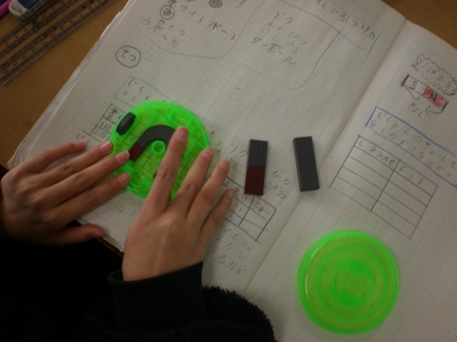 磁石の性質を調べる実験を行います。N極とs極の組み合わせを考え、近づけていくとどうなるかを予想します。