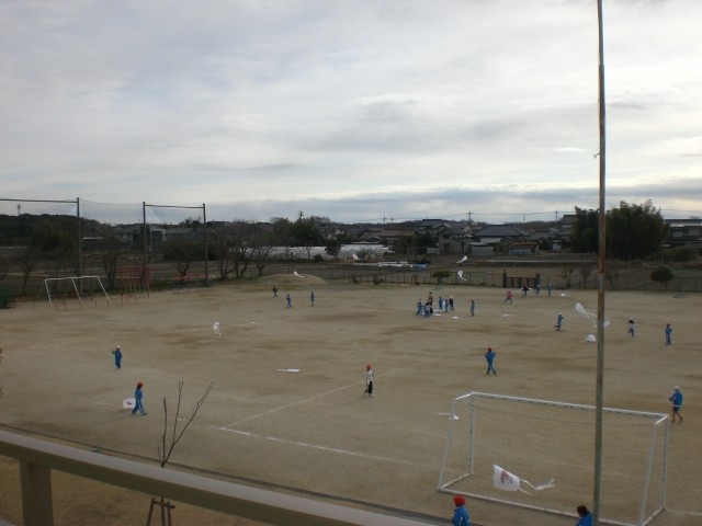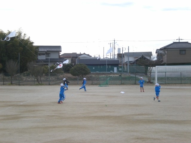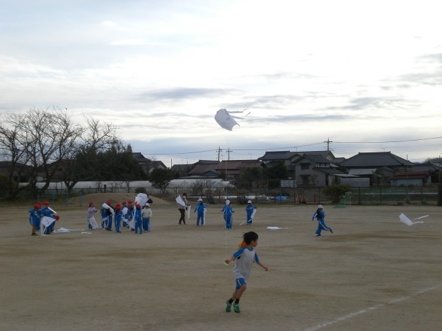 生活科で作った凧を使って凧あげに挑戦します。あいにく風が弱いので、走って凧を引っ張ってみます。見事に上がりました!