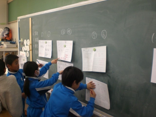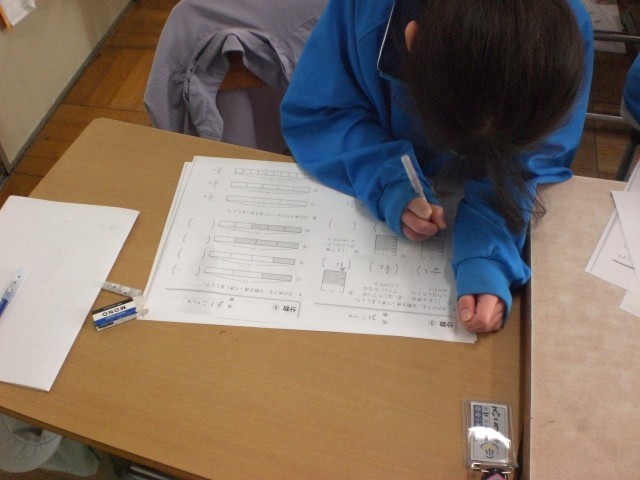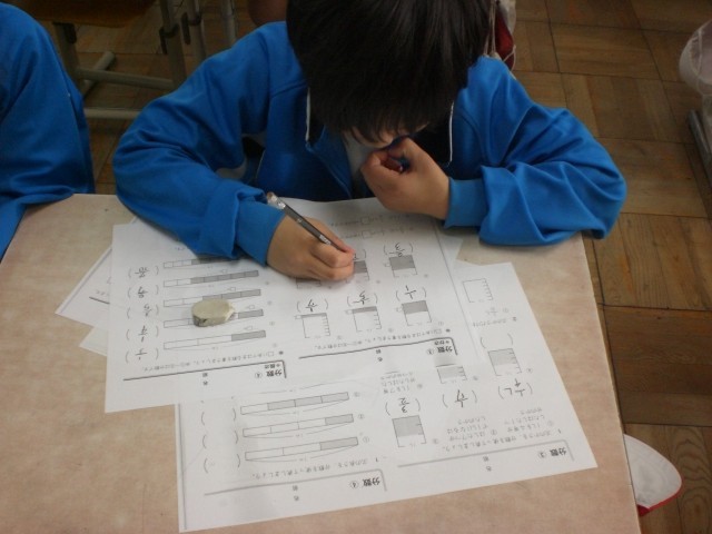 分数の学習。練習問題プリントに取り組んでいます。わからないところは教え合いながら、自分のペースで学習します。