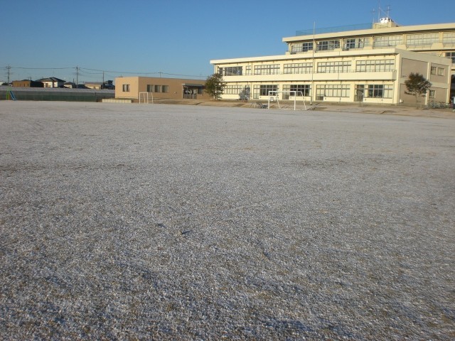 寒波の影響で、大量の霰に覆われた朝の校庭。登校してきた子供たちもこの光景を見て驚いていたようです。