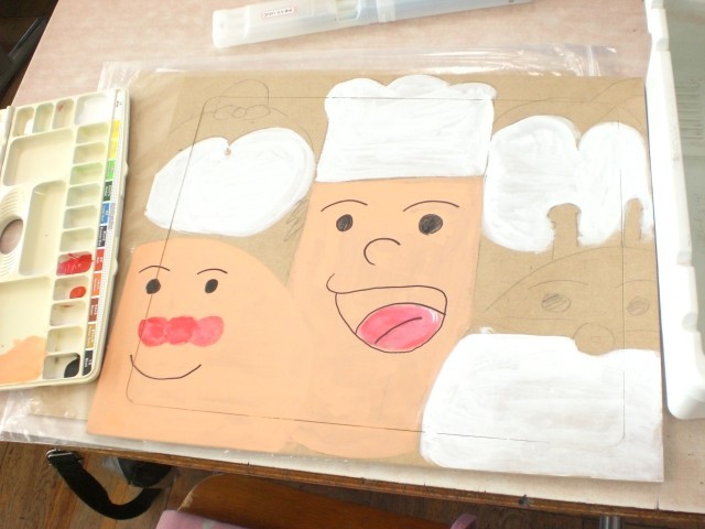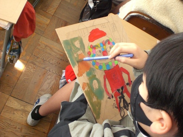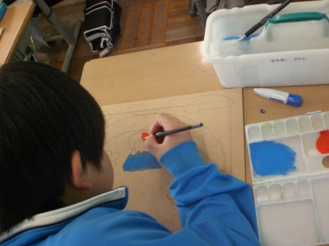 木の板に自由にデザインをして色を付けます。完成したら、糸のこでパーツごとに切り分けてさらに工夫して作品づくりを行います。。切り分けたあとの完成作品をイメージして作ります。どんな作品になるでしょうか。