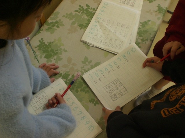 算数で学習した10より大きい数。今日は10~90までの数ビンゴに挑戦。教室内外にあるものを数えて、あてはまる数を消していきます。みんな必死で数えていました。