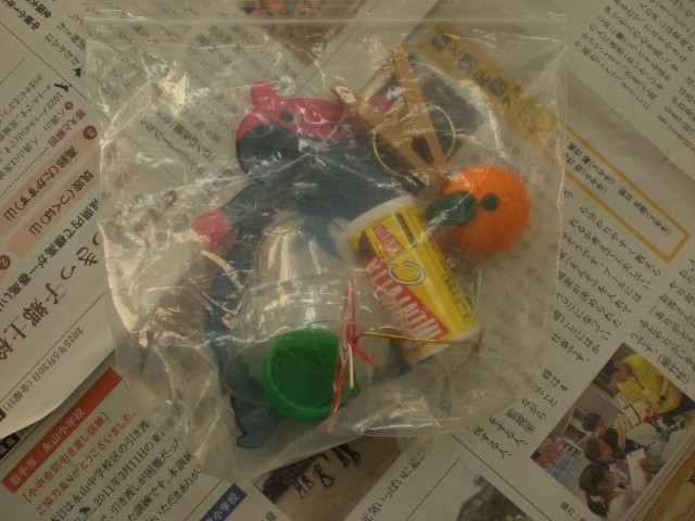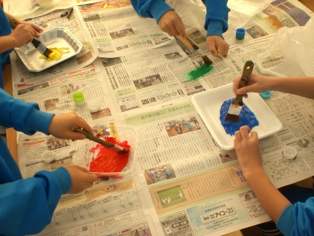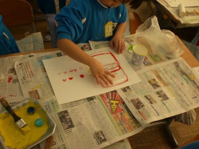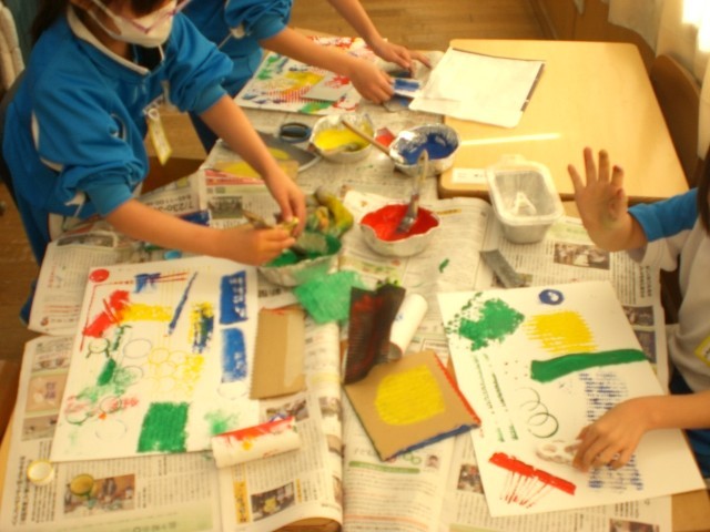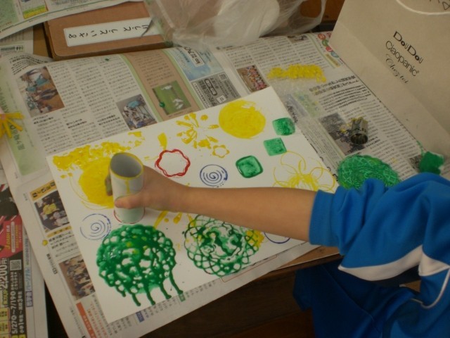 図工の時間です。家から持ってきたいろんなものに絵の具を付け、スタンプとして使います。独創的な作品がずらり。