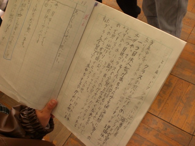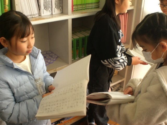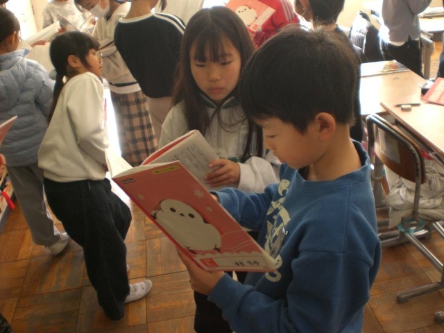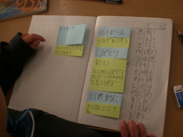 国語の授業です。クラスの思い出作りのためというねらいをもって、どんなことをしたいか、その理由を添えて提案する文章を考えます。付箋に自分の考えをメモして整理し、文章化します。完成した文章を友達と読み合って推敲します。