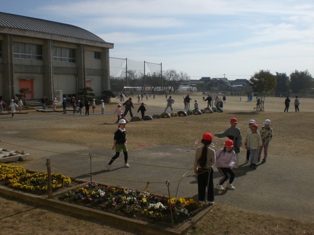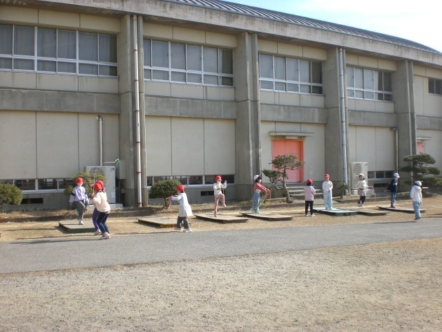 休み時間の様子です。低学年ではなわとびが人気です。大なわを使って、連続とびにもチャレンジしています。
