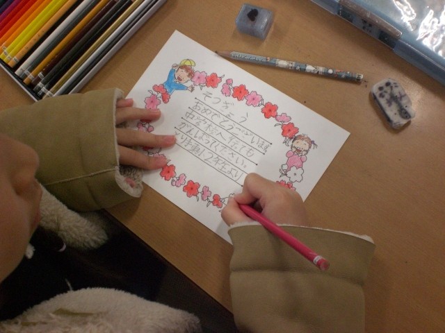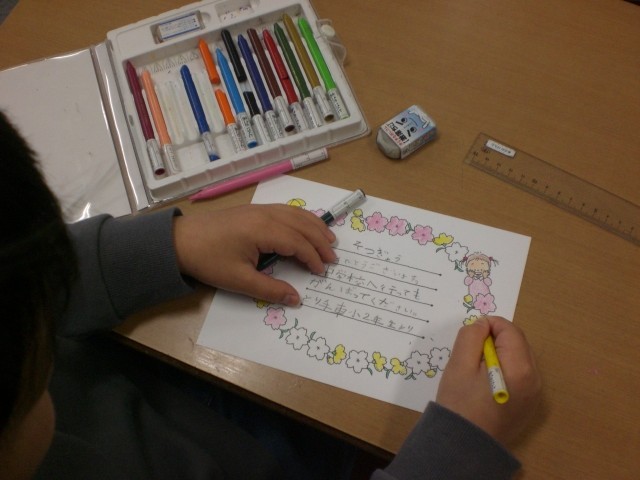 3月に開かれる6年生を送る会。2年生は、3年生が作っているフォトフレームに入れる、メッセージづくりを担当しています。