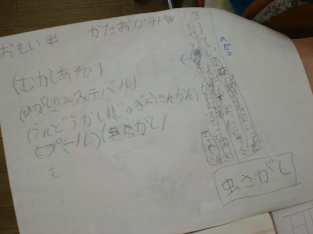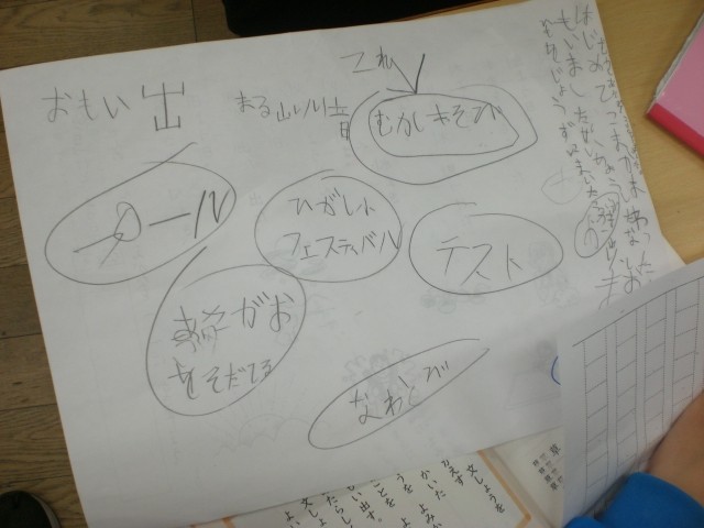 国語の時間です。入学してからいろいろな思い出ができました。その思い出を整理して、作文にあらわします。まずはイメージマップをつくって、どんなことがあったかを整理します。