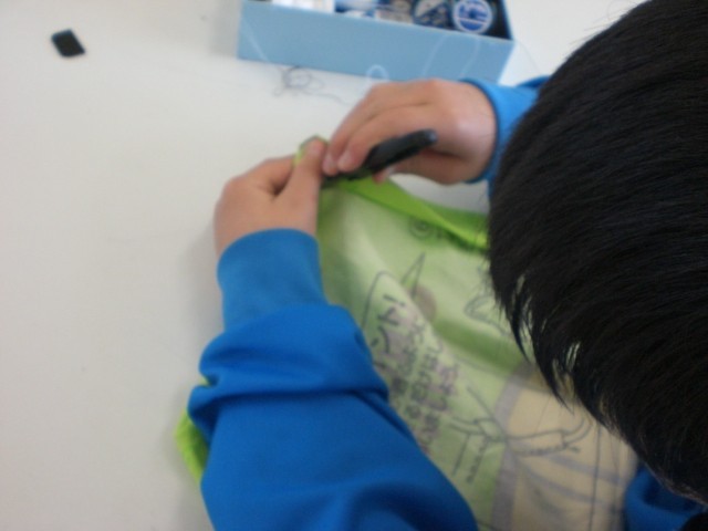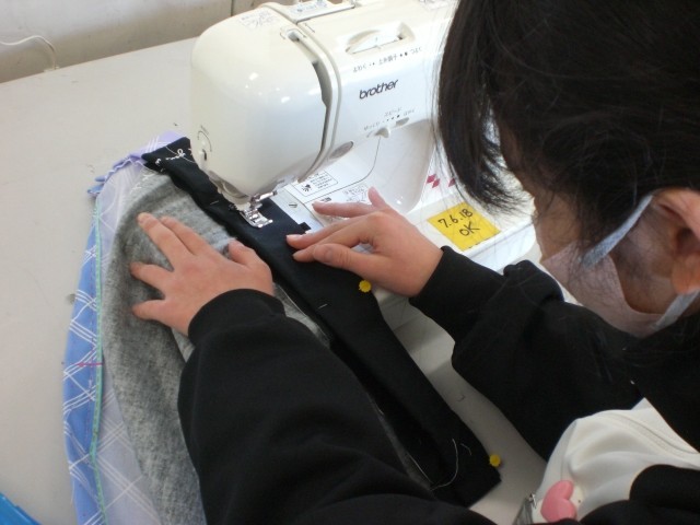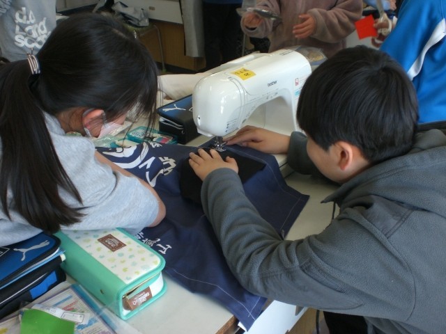 ミシンの操作方法に慣れたところで、エプロンづくりに挑戦しています。どんなエプロンができるかな。