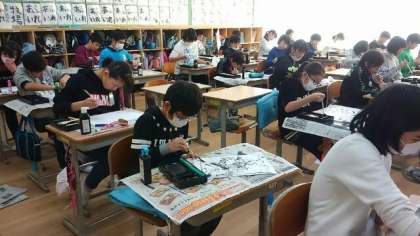 6年生 墨絵を描きました。 公開日 2017/02/01 更新日 2017/02/01 6年生のページ 図工の時間に、墨絵を描きました。筆、ストロー、ローラー、スポンジ、ヒモ、ビー玉、指や手のひらなど、様々なものを使っていました。上手にできました!