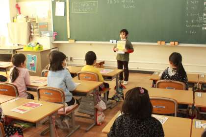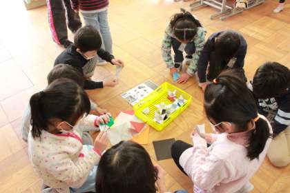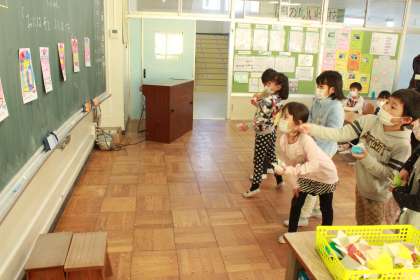 今日は節分です。昨日,みんなでつの箱を作り,今日はその箱に大豆を入れ,自分の心のおにに向かって投げました。大きな声で,「おにはそと!ふくはうち!」