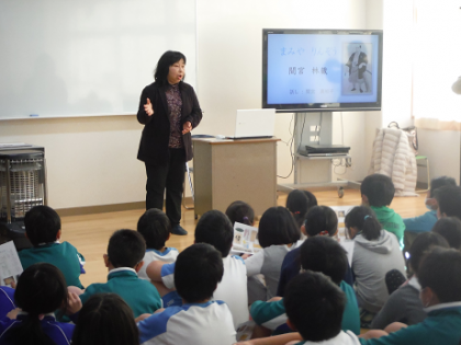 キャリア教育「間宮林蔵さんについて」 公開日 2017/02/15 更新日 2017/02/15 4年生のページ 今日,キャリア教育として間宮林蔵さんのことを教えてもらいました。間宮林蔵さんの子孫である間宮さんが講師としていらしてくださいました。子供のころの遊びの様子やカラフトに行き,カラフトが島であること発見し,カラフトとロシアの間にある海峡を間宮海峡と名付けたことを教えてもらいました。子供たちは,初めて知り感心していました。