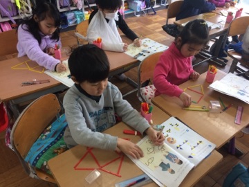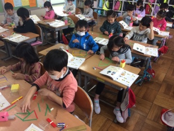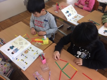 数え棒を使った学習です。数え棒でいろいろな形をつくり、何本でてきている形か確かめました。