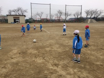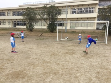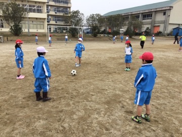 体育では、ボールけりあそびをしています。パスをする練習、ボールを止める練習を中心に頑張っています!