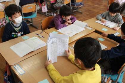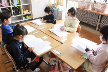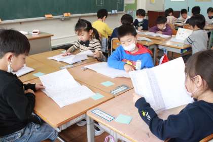 【1年生】作文を読み合いました。 公開日 2017/03/21 更新日 2017/03/21 1年生のページ 1年間のまとめとして,楽しかったことや頑張ったことを,季節ごとの作文に表しました。今日は,友達と作文を読み合い,感想を伝えました。自分ができるようになったことや頑張ったことを友達に認めてもらい,嬉しそうでした。