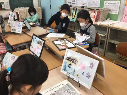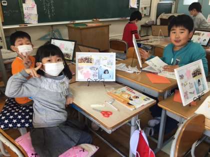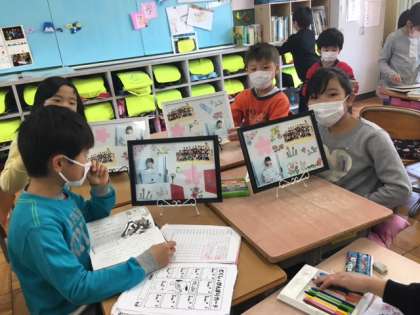 1年生の思い出を写真たてにしました。飾りを工夫して思い思いに作っていました。ぜひお家で飾ってください。