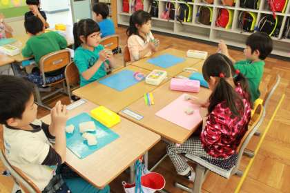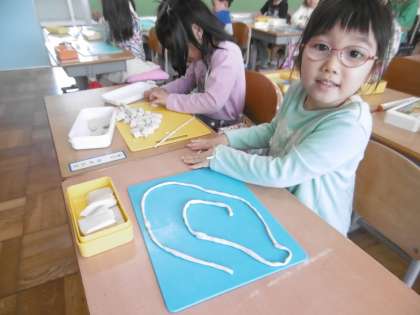 今日,図工の時間「ひもひもねんど」で粘土を使って,長いひもを作りました。始めは,粘土が固く柔らかくするのをがんばりました。粘土板の上でくるくる長くしたり,両手でくるくるしたり工夫しながら作ることができました。