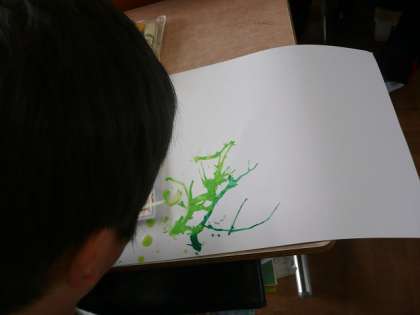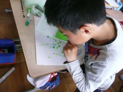 今日の図工は,「絵の具でゆめもよう」の作品を作りました。ストローを使って紙に落とした絵の具に息を吹きかけると,絵の具の線がぐんぐん伸びていきます。ビー玉を使って紙の上に絵の具を転がすと自在にもようができていきます。みんな夢中になってつくっていました。