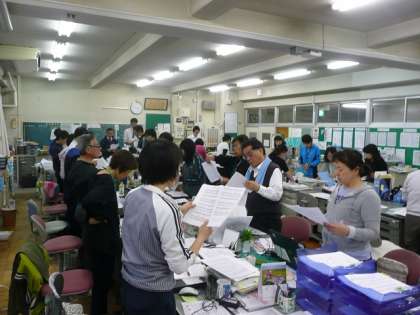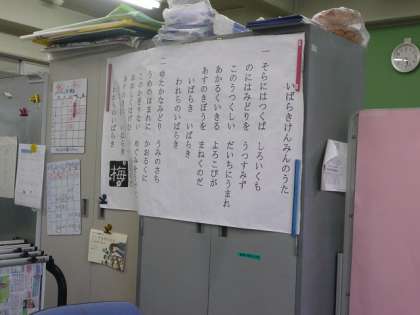 職員会議では、はじめに「茨城県民の歌」を歌ってから会議を始めています。職員室では、いつでも歌えるように歌詞の掲示がされています。